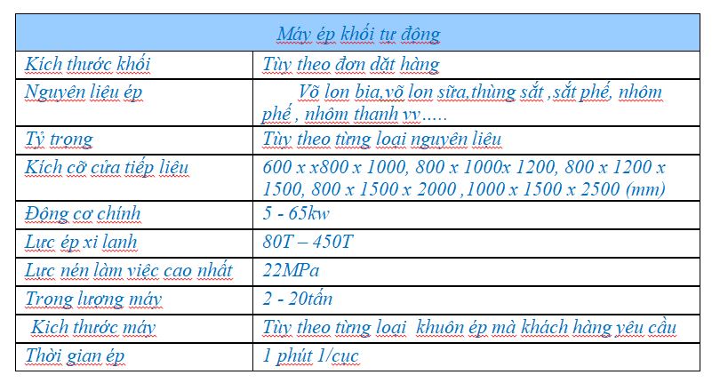 Tham khảo thông số 1 máy ép tự động, tuy nhiên chúng tôi có nhiều cỡ máy khác nhau: Chúng tôi mong được hợp tác và làm hài lòng Quý Khách. Xin liên hệ với chúng tôi